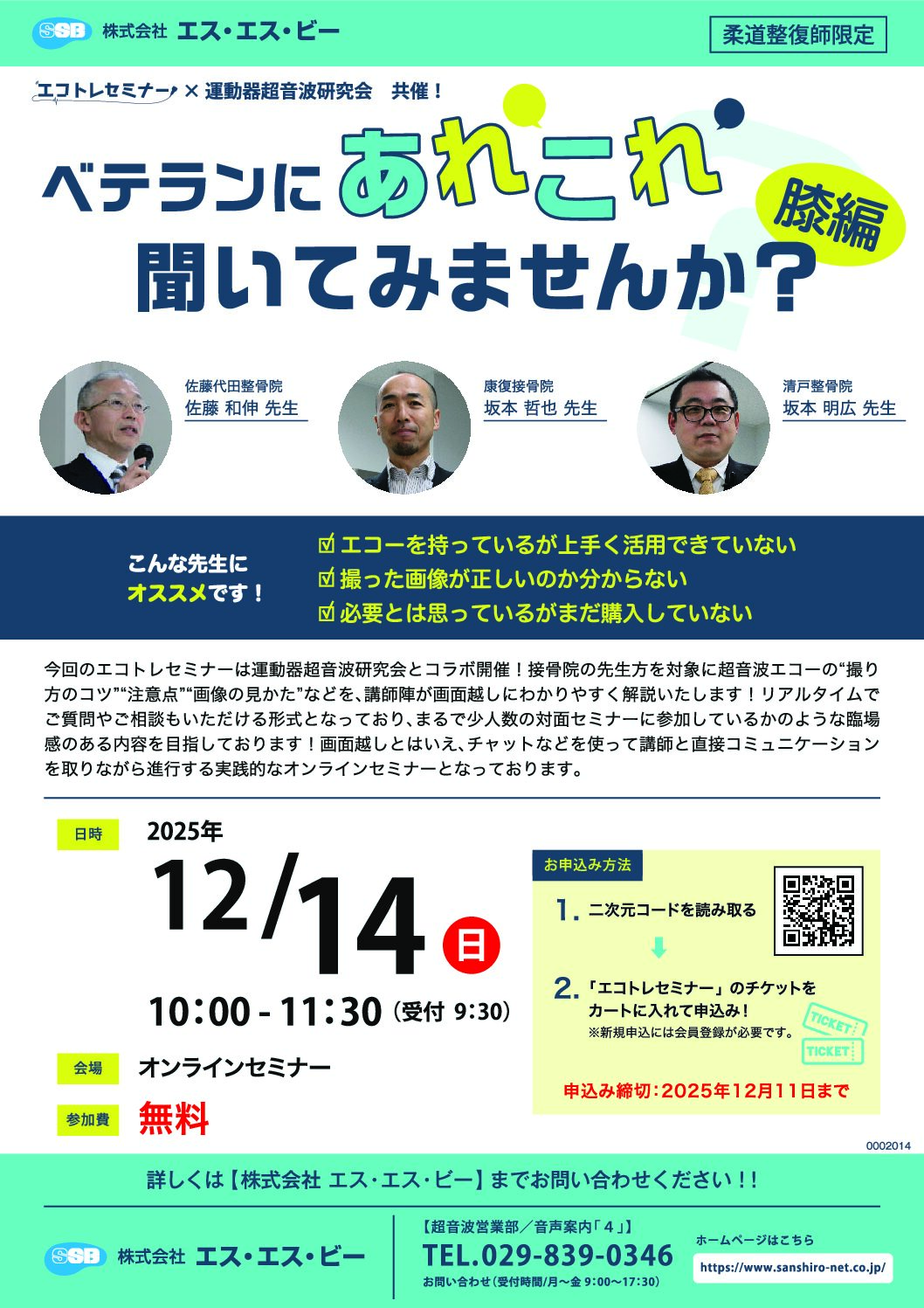 今回のエコトレセミナーは運動器超音波研究会とコラボ開催!接骨院の先生方を対象に超音波エコーの “撮り方のコツ”“注意点”“画像の見かた”などを、講師陣が画面越しにわかりやすく解説いたします!